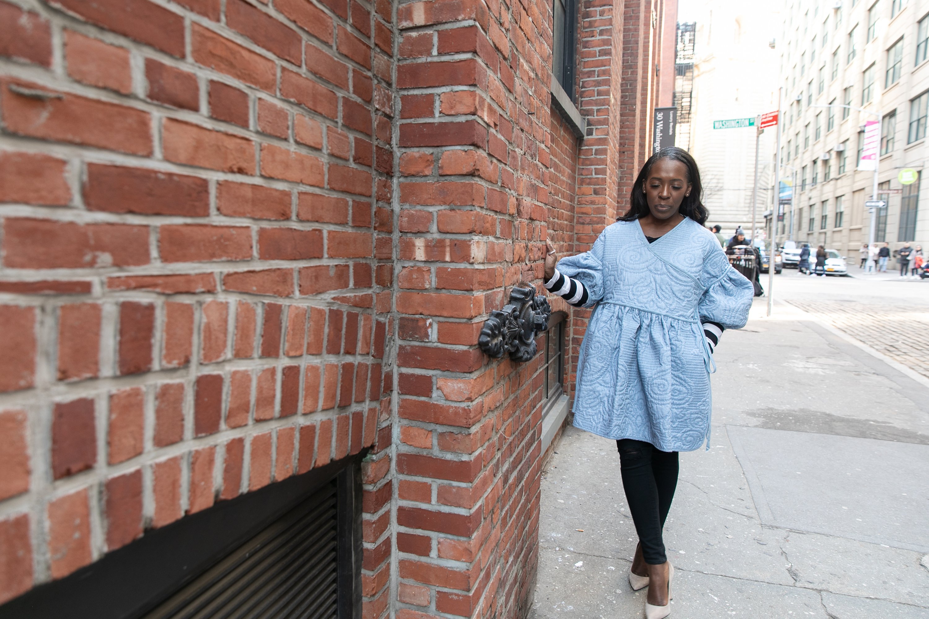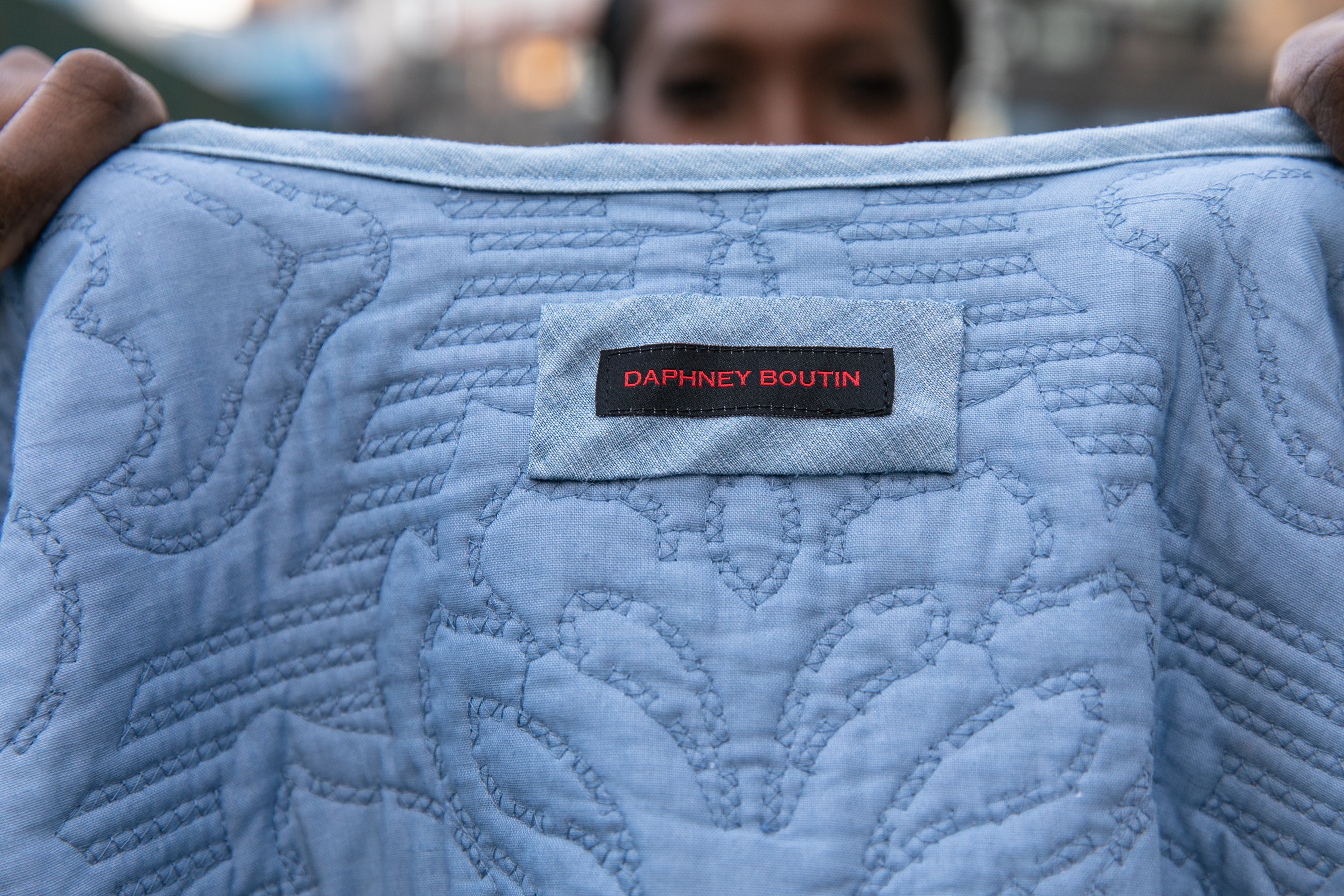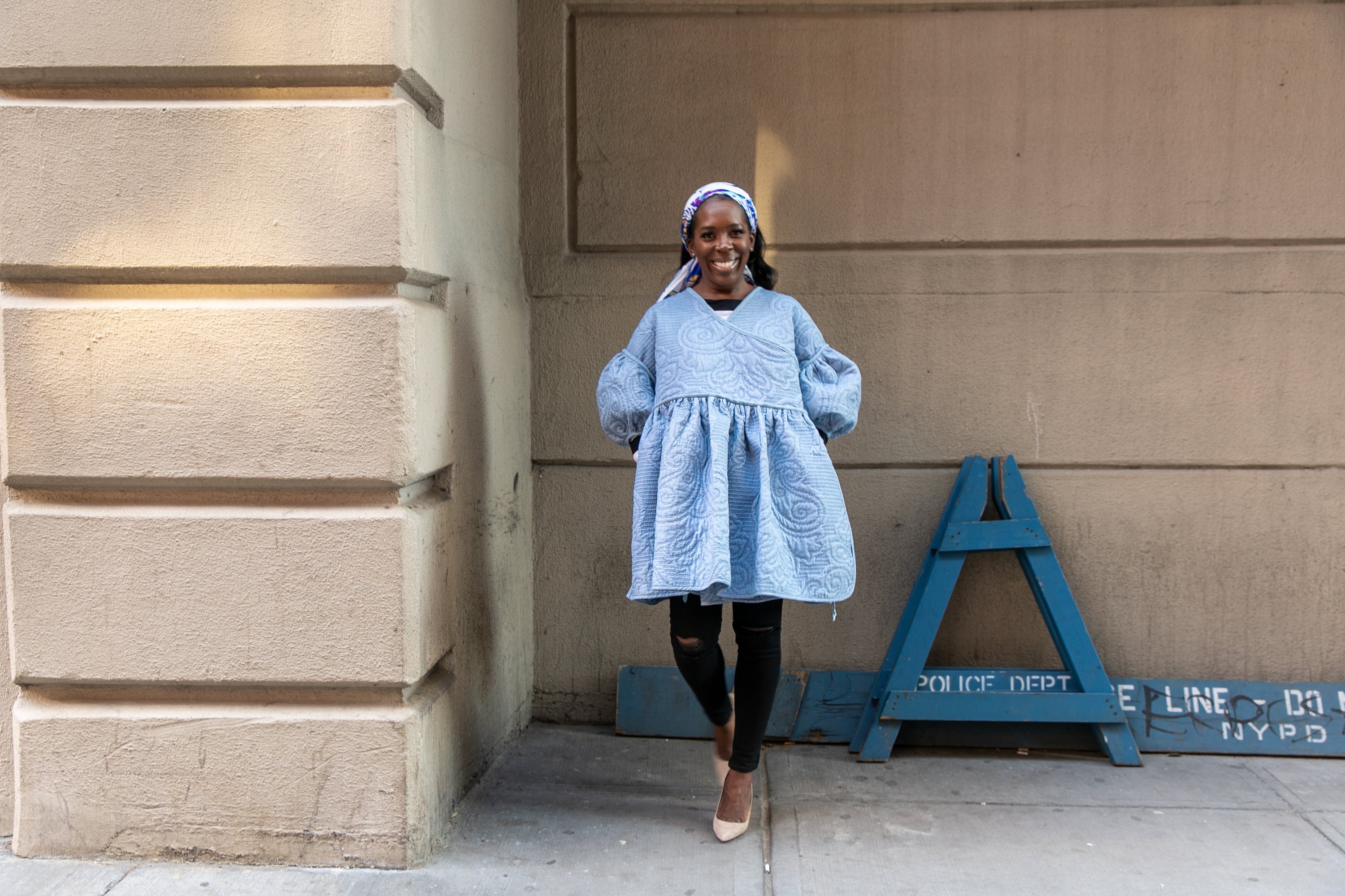 View D of the Simplicity pattern had the drop shoulder I needed so I just made 2 front pieces that overlapped. The Butterick pattern had the billowy sleeves I wanted. That’s literally all I took from there. The only other thing I needed was a similar chambray denim to make A LOT of bias binding. I found the perfect match at Mood Fabrics. I initially missed this denim because the side showing not the bolt was it’s darker side. But guess who wasn’t leaving Mood without something matching? This gal!!! I looked and looked and looked a third time. I kept going back to this although it was a bit darker and I kept comparing it to the quilt and happened to flip it over and WAIT a minute! This is exactly it!!! I gasped. My eyes bulged and looked around for someone to high five. (Cue Keith Sweat, NOBODY!) I grabbed a yard and a half and trotted home a satisfied girl as I waited for the patterns to come in.