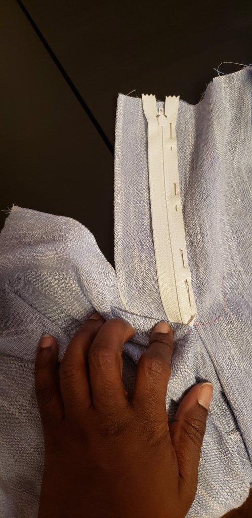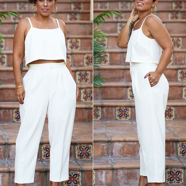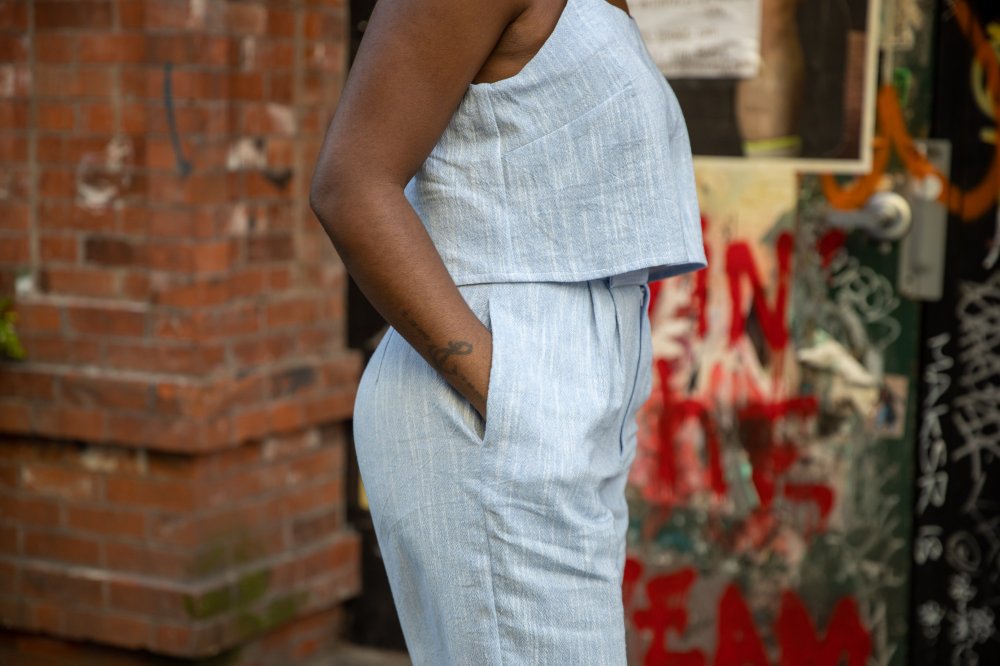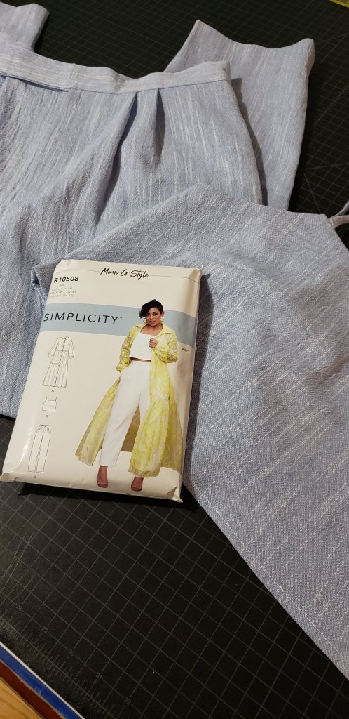 Back in February, I’d won a gift certificate from I See Fabric on Instagram. I luckily had enough to get some organic French terry that I made this sweatshirt hack from as well as some beautiful cotton chambray that is unfortunately no longer available, it seems. I wasn’t sure what I’d make but I just grabbed my standard 4 yards. So glad I did! It’s a super pretty linen looking and linen feeling fabric. I was flipping thru my patterns and thought this coordinated set (Simplicity 9114) would be real nice in it! I halfway cringed at making pants (then) but I was determined to conquer pants making and I hope to be a pant-making fool (now)!! The only adjustment I made to this was add 4″ to the waist tab to accommodate for my quarantine waist fullness. **shrug emoji**