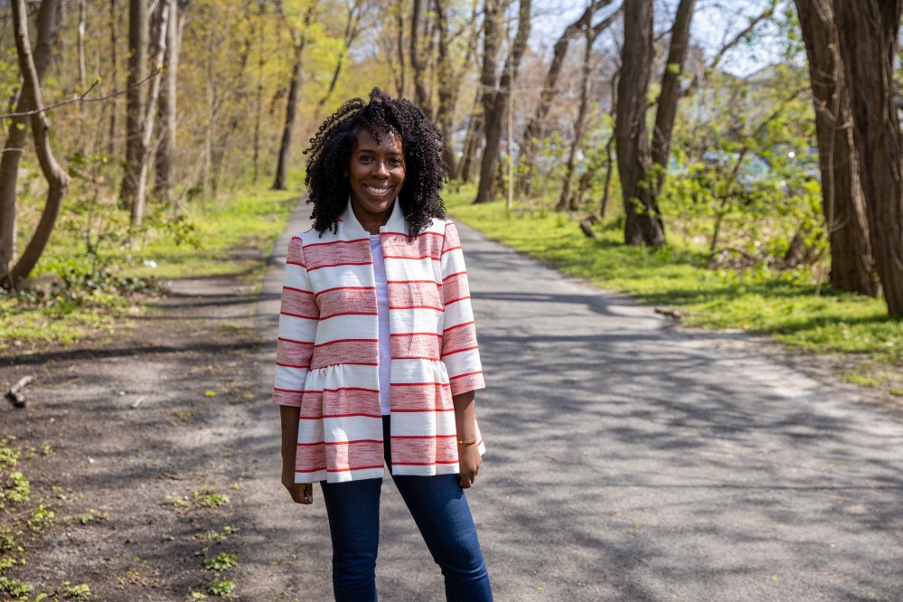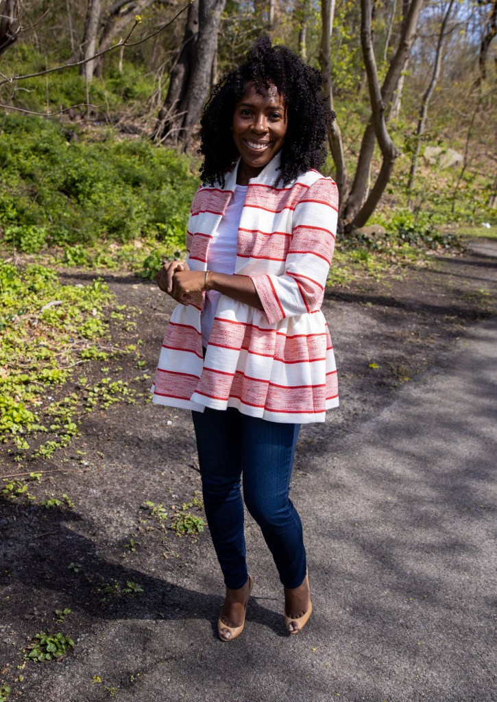 This jacket caught my eye for a few reasons! 1. The blue and white stipe is always a fave of mine! I should count how many items I have in my closet in blue and white stripes. You’d be either impressed or confused. 2. The 3/4 sleeves! That’s been my thing lately. I like having a little sexy wrist actin showing and it allows for my stacked bracelets to be seen or for me to easily access my watch. 3. The ruffle! HELLO! We already KNOW that I love a ruffle detail. 4. What I thought was a knit bomber collar. HAHA. Let’s take a closer look, shall we…….