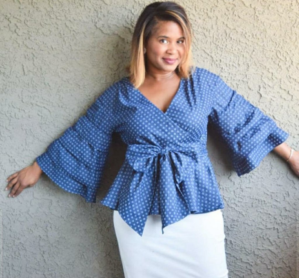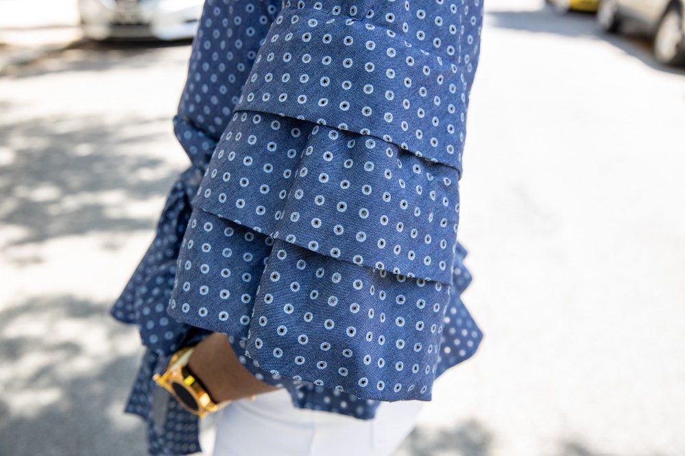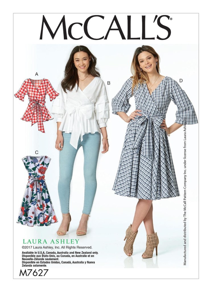 Back in 2017, one of my fave IG-ers (who, I just found out while gathering links for this blog, is no longer on IG!!! She literally posted within the past 2 weeks and now her account is gone! **sad emoji**) posted about her progress as she made this McCall’s 7627 Laura Ashley pattern in the top version in an indigo chambray with woven holes from Stylish Fabric. This was a few years ago so the fabric is no longer available.