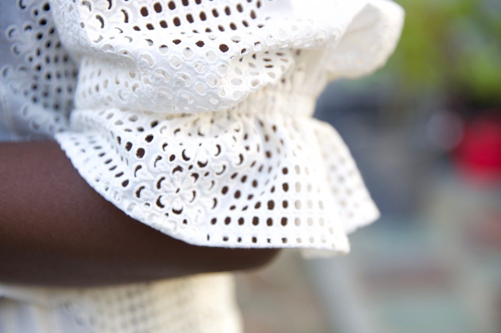 I saw this gorgeous Zimmerman eyelet lace on Mood’s website and immediately bought a few yards. I wasn’t sure what I’d make with it. I finally decided on a sort of wrap skirt (almost done with that by the way) but then an idea for a girly sweatshirt popped to mind. I wanted to make both so I had to go on and buy a few more yards before it sold out. As it turns out, the 2 pieces were from different dye lots and looked noticeably different in color so I can’t really wear these pieces together. (Note and warning to myself and others on buying the same fabric separately)