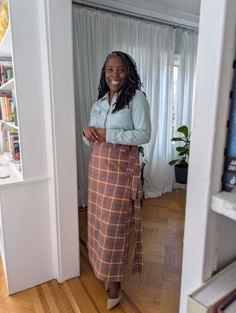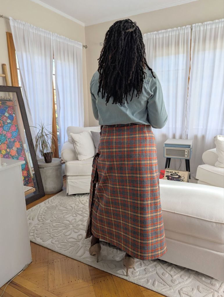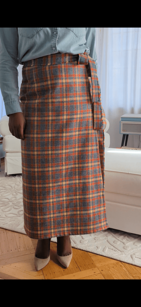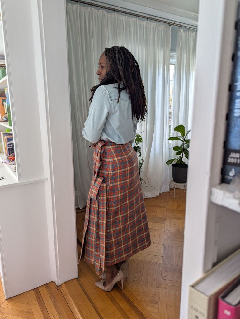 I’m trying my level best to use up fabric I have in my stash and I knew I had a plaid flannel that would work perfectly! I’d gotten it from Joann Fabric last year I think. They always have nice soft flannel plaids. Just a few additions made it feel like a whole new skirt. I added 4 inches to the length to make it a maxi and I added another set of ties at hip level. I also used the selvedge edge of the fabric as a design detail for the waistband and the ties. And funny enough, I’m a size or 2 bigger than when I first made the skirt. I wasn’t going to worry about it much until I went to go pull the pattern and noticed that the back skirt piece was missing. I decided to cut just a new back in one size larger and it actually fit amazing. I didn’t need a whole size larger so making just the back one size larger was perfect!